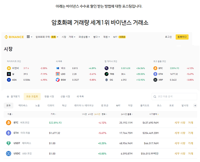 바이낸스 수수료 거래료비용 할인 바낸 코인해선 binance신규회원 신설하기